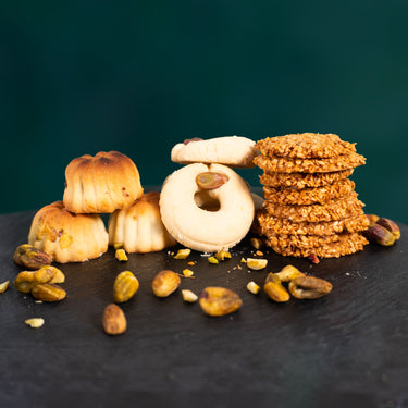 Zarter, hausgemachter Teig trifft auf feine Pistazien, aromatischen Sesam und die milde Süße ausgewählter Datteln. Jedes Gebäck entsteht in traditioneller Handarbeit, mit Aufmerksamkeit für Details und ohne Farb-, Zusatz- oder Kon triggering substances.